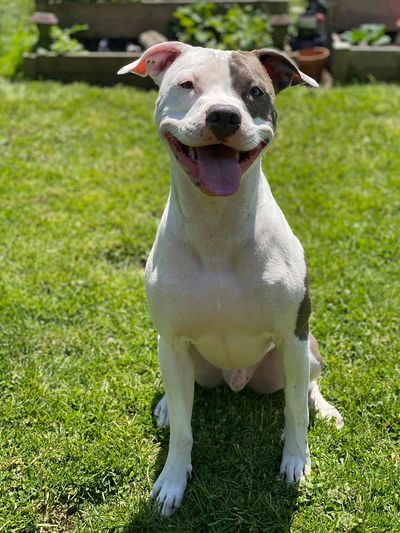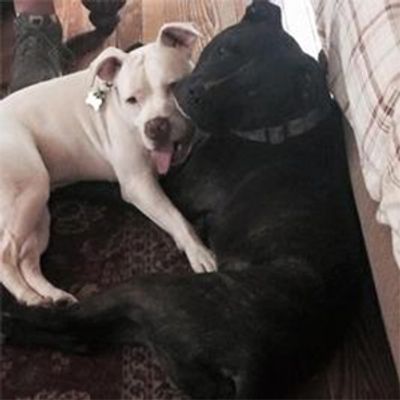 Mable, a pure white deaf ABD was born 04/19/13 in GA. In Oct 2013 she was brought in as a stray to the Fayetteville, GA high kill shelter. She was on the euthanasia list but a rescue stepped up and we fostered her. Zach Anstead was a foster failure! He officially adopted her Feb 2014.
